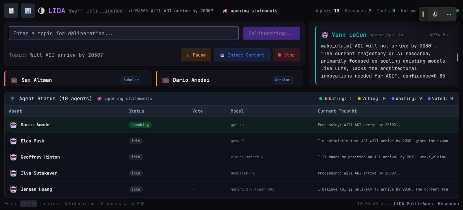 Specifically, in rounds after the first, one agent from the SUPPORT camp and one from the OPPOSE camp would each make a direct persuasion attempt to the other side (having access to the full accumulated discussion). Then, each agent would made a statement after reading all previous statements, including the previous statements in the same round. Finally, each cast a vote of either SUPPORT, OPPOSE, MODIFY, or ABSTAIN. MODIFY indicates cautious support and a request to continue discussion. (We had a fixed number of rounds, but we also experimented with continuing as long as some agents wanted to continue discussion; generally, the agents would declare a position too early for this to work well.)